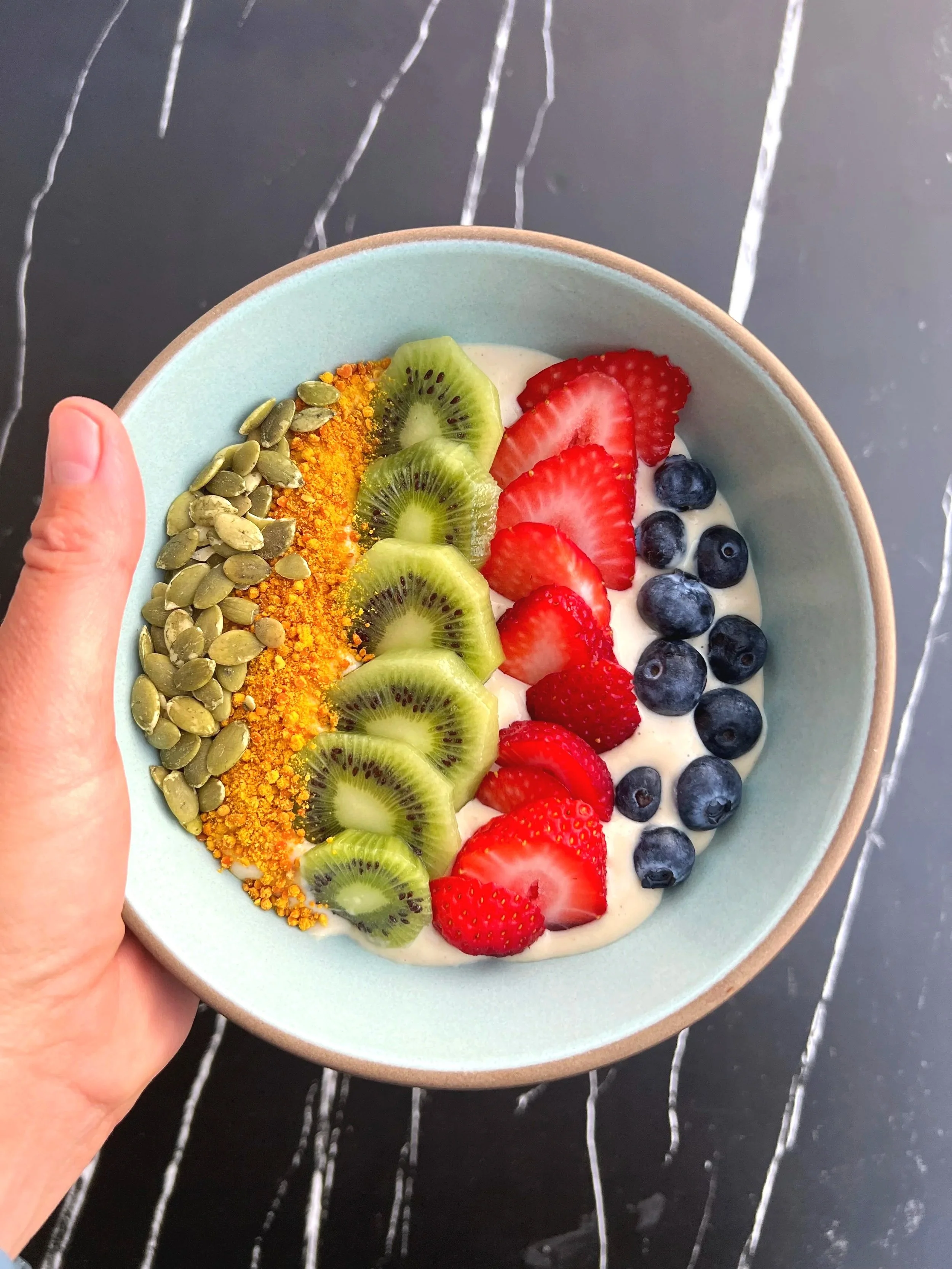 Top with kiwi, strawberries, blueberries, sprouted pumpkin seeds, and finish with a sprinkle of bee pollen.